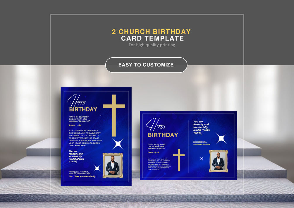 A set of 2 professional church birthday card templates, ideal for celebrating members, leaders, or your church’s anniversary with faith and elegance.